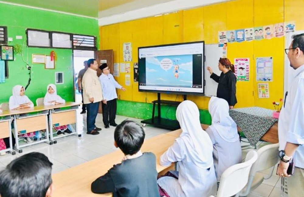 Presiden Prabowo Subianto dan Mendikdasmen Abdul Mu’ti menyaksikan penggunaan papan interaktif (smart board) dalam pembelajaran di Sekolah Dasar. -BPMI Setpres-