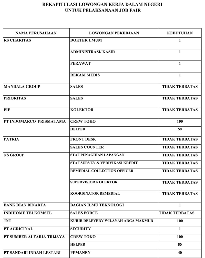 Job Fair ini menghadirkan puluhan perusahaan dengan beragam kebutuhan tenaga kerja, mulai dari tenaga medis di RS Charitas, penjaga toko di PT Sumber Alfaria Trijaya (Alfamart), hingga posisi di sektor logistik, keuangan, dan manufaktur.