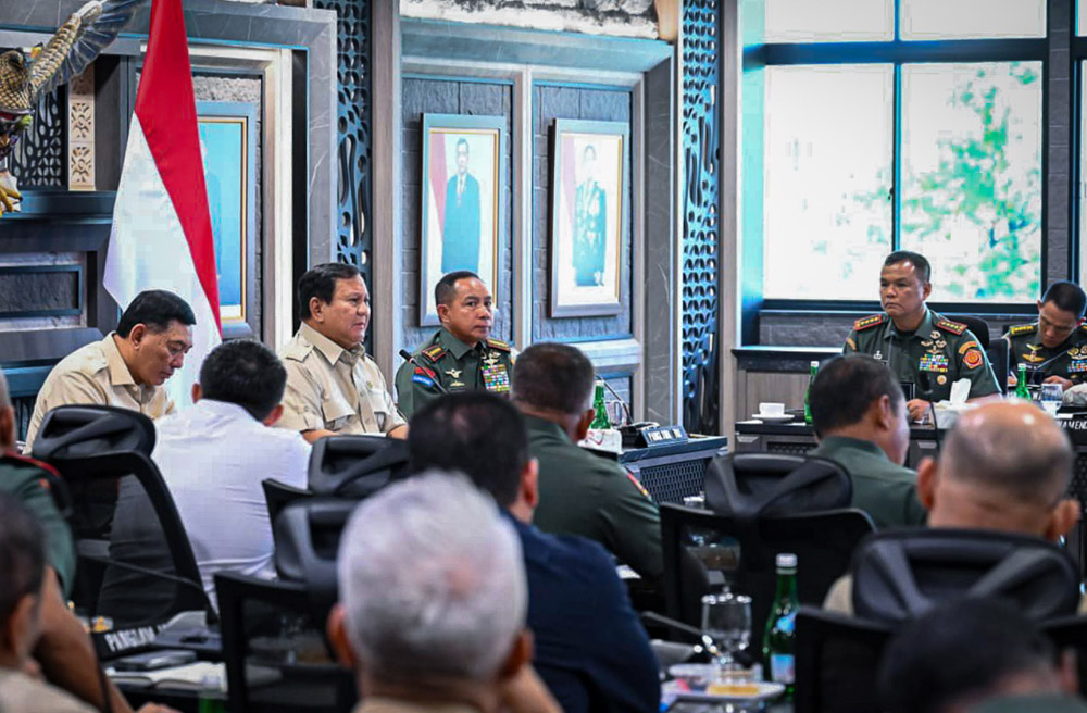 Presiden Prabowo Subianto menegaskan komitmen pemerintah dalam memperkuat ekonomi rakyat saat memimpin langsung evaluasi percepatan pembangunan Koperasi Desa/Kelurahan Merah Putih (KDKMP) di Markas Besar TNI, Jakarta, Selasa (25/11/2025).- BPMI Setpres-